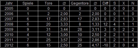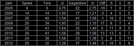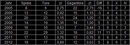 Nachfolgend weitere Daten zu unseren Spielen am Großfeld. Leider konnte 2012 keine positive Tordifferenz erreicht werden. Man sieht aber auch schön, dass wir vor allem bei 90 Minuten Spielen (Freundschaftsspiele, Spring-Cup) unsere Probleme hatten. Die kürzeren Turnierspiele konnten wir erfolgreicher gestalten.