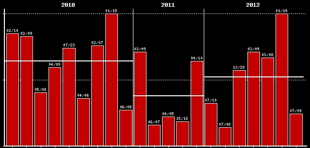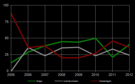 Insgesamt absolvierte Roter Stern 2012 25 Spiele am Großfeld, davon konnten 10 Spiele gewonnen werden, 6 endeten Unentschieden und 9 Matches gingen verloren. Das ist jetzt nicht die beste Ausbeute der letzten Jahre, aber zumindest konnten wir wieder mehr Siege als Niederlagen einfahren. Die Verbesserung zum Vorjahr ist sehr schön im folgenden Diagramm zu sehen. (Genau diese Werte hab ich zum Beispiel auch in der Einleitung gemeint – vom Gefühl her hätte da keine positive Entwicklung abzulesen sein dürfen…)