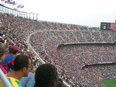 Eine Stunde vor Spielbeginn gings dann am Sonntag mit der Metro ab zum Stadion, wo sich bereits eine unglaubliche Menschenmenge eingefunden hatte. Für uns lief natürlich die Zeit, waren wir doch auf der Suche nach einem der bekannten Restkartenverkäufer, die noch Restkarten besassen. Und endlich, nachdem das Spiel bereits begonnen hatte, und ein Raunen nach dem anderen sich aus dem Stadion erhob, und die Menschen, die bisher noch recht unbekümmert am Stadioneingang standen, schlussendlich auch dazu bewegte sich eiligst auf die Tribüne zu bewegen, entdeckten wir einen dieser Geschäftsmänner, der uns Karten für 50 Euro anbot. No, gracias, so hatten wir uns das nicht vorgestellt.